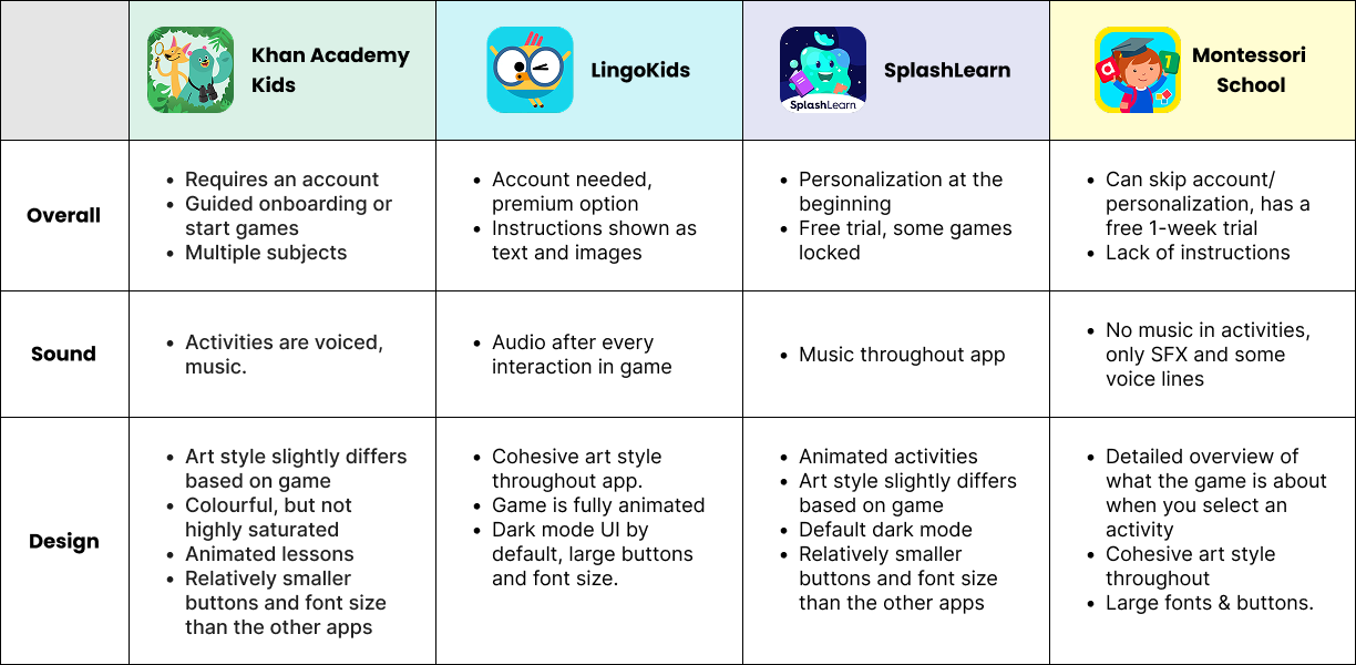 I did a Competitor Analysis gained an understanding of existing experiences and design patterns which helped me later on when I was developing my own assets. I noted down their user flow, how each taught through gamification, as well as their visual branding.