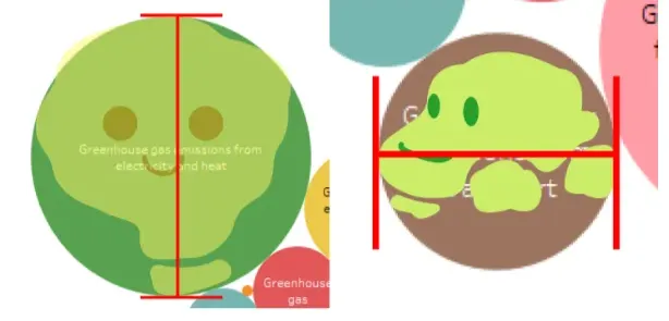 In order to accurately represent the data, bubble charts were created in Tableau. This allowed me to get a meaningful scale of the data. The green house gas graphics were then resized to match their respective bubble.