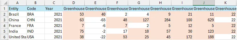 I chose to use green house gas emissions data from Our World in Data for my data source. The first thing I needed to do was narrow down and clean the massive dataset. With the data prepared for each country’s emissions to be visualized, I was ready to start designing.